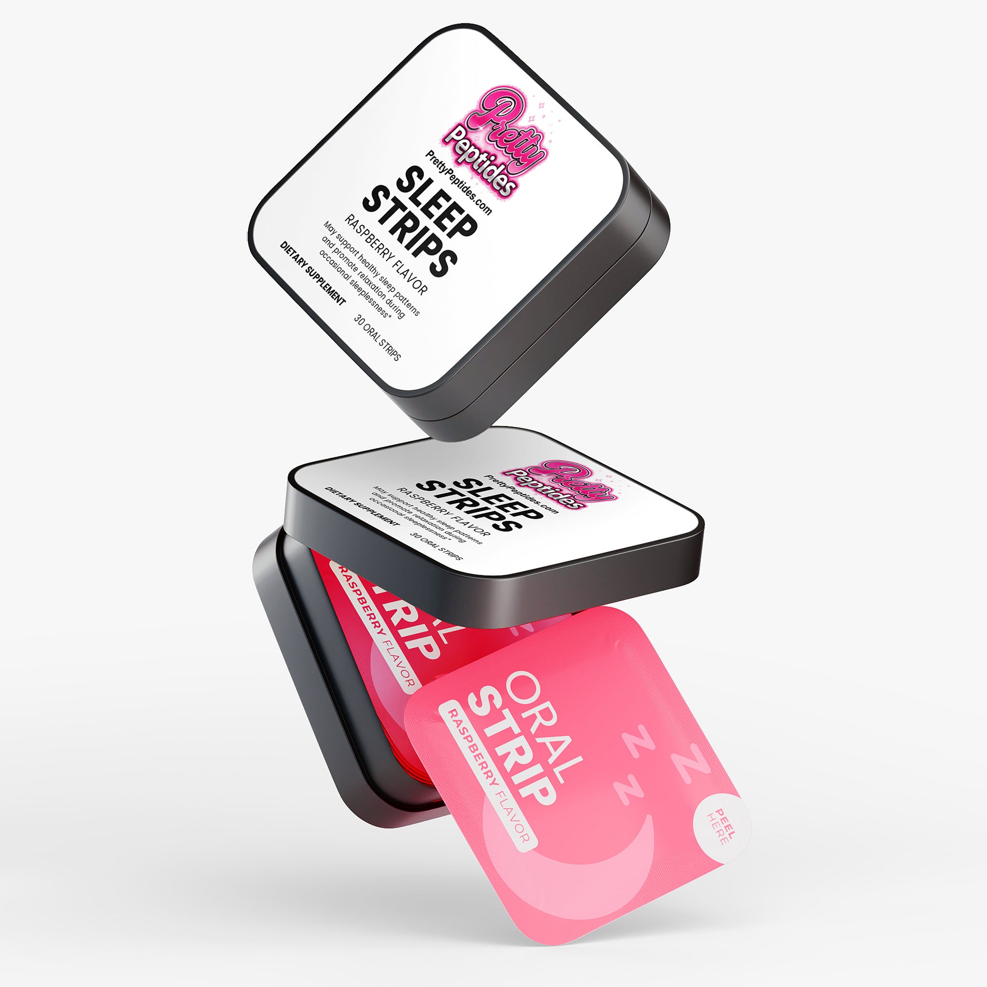 Ingredients: Pullulan, Valerian root extract, Lavender extract, Chamomile extract, Hibiscus extract, Cellulose, Raspberry Flavor, Malic acid, Xylitol, Lecithin, Erythritol, Sorbitol Syrup, Medium Chain Triglycerides, Steviol Glycosides, Melatonin